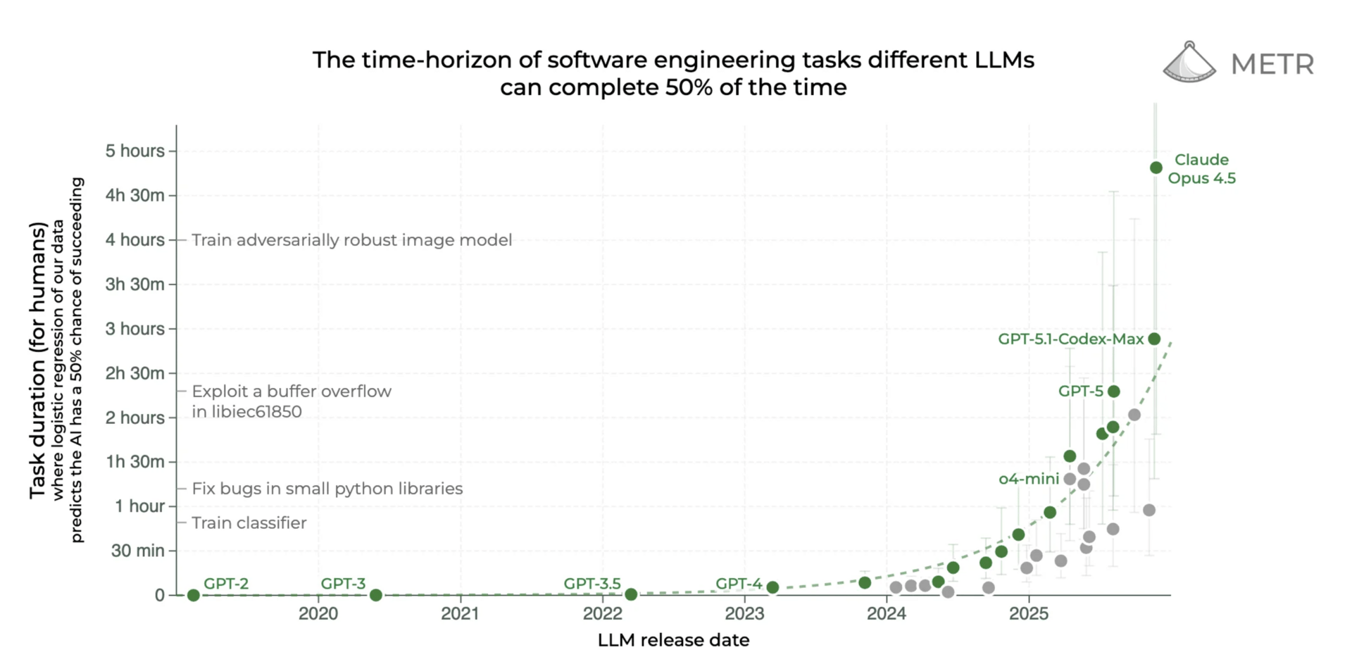 This is not “slow and steady.” This is compounding and even hyper-exponential in the case of agentic task duration benchmarks..